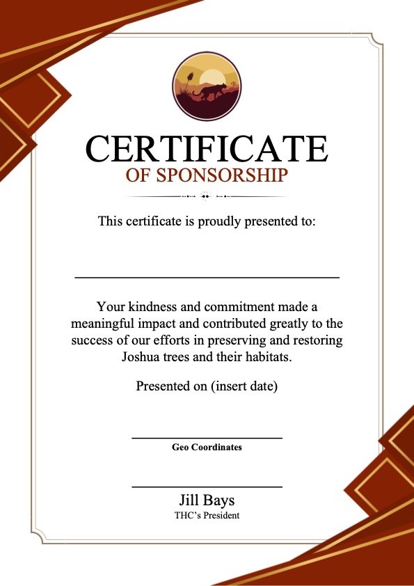 IFor a $250 sponsorship, adopt a named Joshua tree and support Transition Habitat Conservancy’s work to preserve and restore Joshua tree populations and their ecosystems. Your adoption registers your tree on Transition Habitat’s website for one year and helps fund on-the-ground conservation, habitat restoration, and community science efforts.